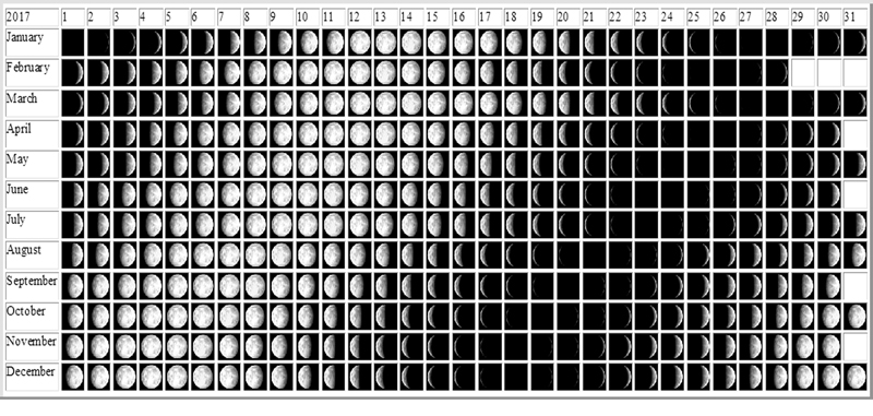 This calendar depicts the Moon phases by day for each month of the entire year on one sheet of paper as shown below: