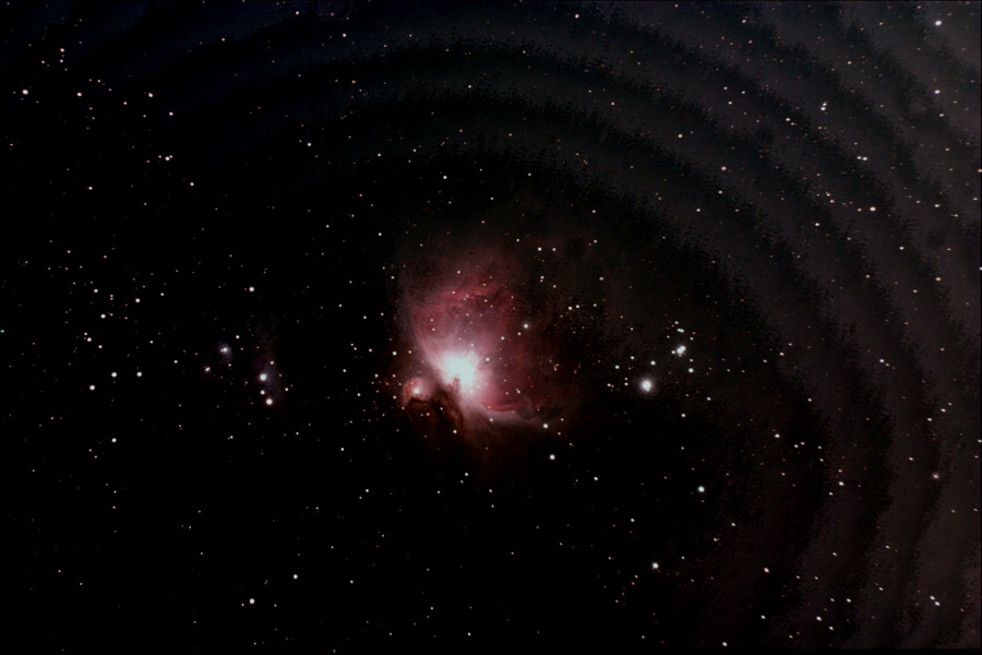 Next I slewed to M42. Many guide stars to chose from through the ST80. Kept exposures short (30 seconds) because of the bright moonlight. After calibration with flats, there were wide bands (rings) around M42, as can be seen in the image below that is a stack of 48 images. Banding could have been caused by the bright moonlight since I haven't had them before or since.