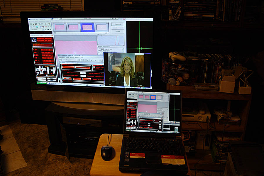 I controlled the imaging setup from my recroom and also had my notebook display on the 50 inch Plasma Screen. The screen is large enough that it can display all of the imaging programs I am running and still have room for a TV channel using Picture-in-Picture:
