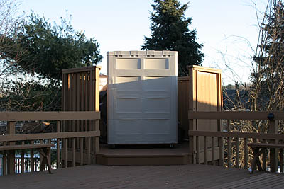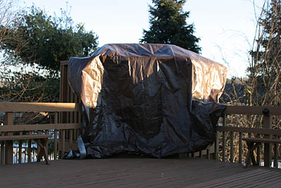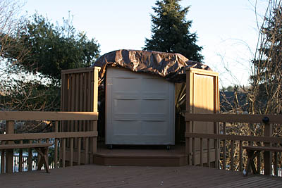 The tarp cover over my plastic storage shed observatory has held up well so far this year, even with some high winds. It keeps the snow off the octoganal area. To uncover the shed I fold the tarp back: