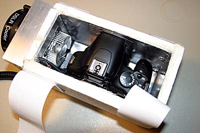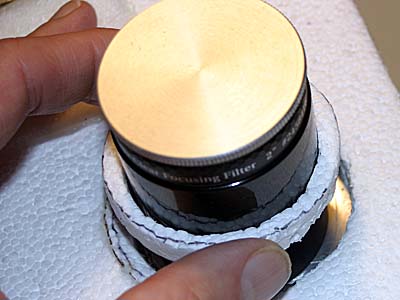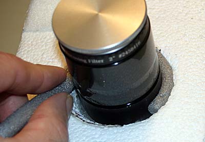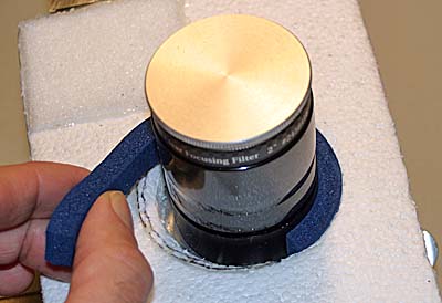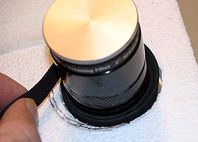 I've also included an assortment of gasket material for the front 2" nosepiece or focal reducer to be used. I've sized the front hole in the styrofoam panel for 65mm. It can be enlarged if needed by light sanding with sandpaper. Below are some pics to show how the gaskets can be applied to fit whatever nosepiece or reducer you will be using. Also enclosed are some weather stripping strips that I've also used. You can experiment and see what works best for you.