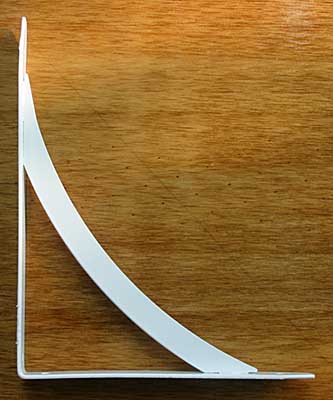 I bought this 8 inch metal shelf bracket at Lowes Hardware. I cut the end off it so it would fit on the chair base and drilled another hole for securing it with wood screws to the chair base.